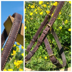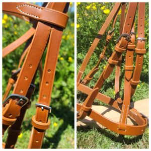 Tous nos bridons sont cousus à la main, point par point, et sont personnalisables : n’hésitez pas à demander pour le choix du cuir et de couleur de fil ! De même vous pouvez sélectionner des pièces de harnachements issus de certains modèles et les combiner entre eux pour un modèle unique !
